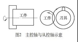 首先兩個主軸要分為主動軸和從動軸,成為同步標(biāo)準(zhǔn)的軸稱作主動軸,與主動軸同步移動的軸稱為從動軸。在多邊形加工中,刀具軸作為主動軸,工件軸作為從動軸(見圖2)。